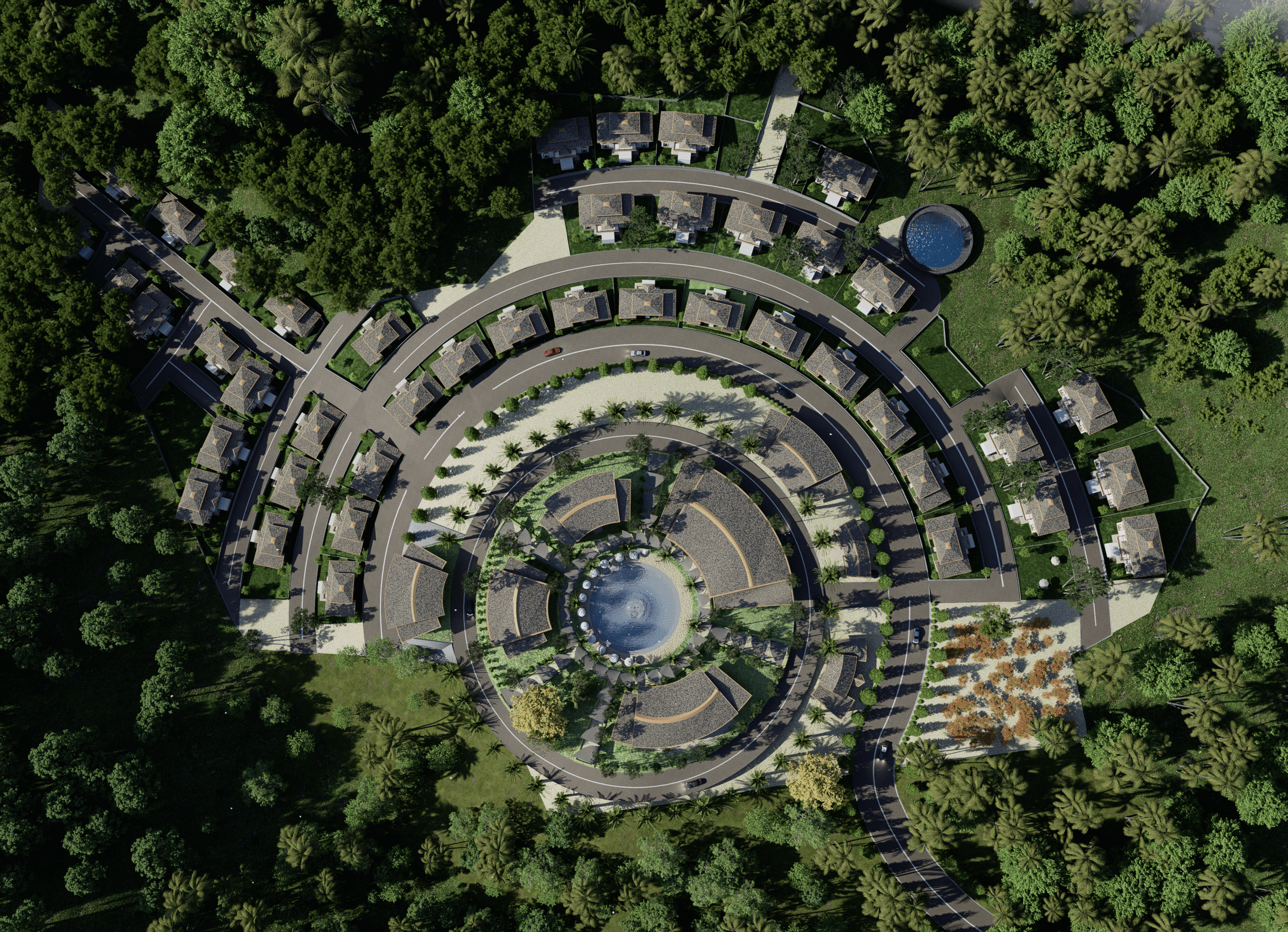 Kokan Vaibhav Resort is a 16-acre master-planned retreat drawing from the timeless elegance of Balinese architecture while responding sensitively to the lush valleys of Mandangad. The layout is organically zoned with clusters of G+1 villas built on 2000 sq.ft. NA plots, arranged to maximize privacy, cross-ventilation, and valley views.